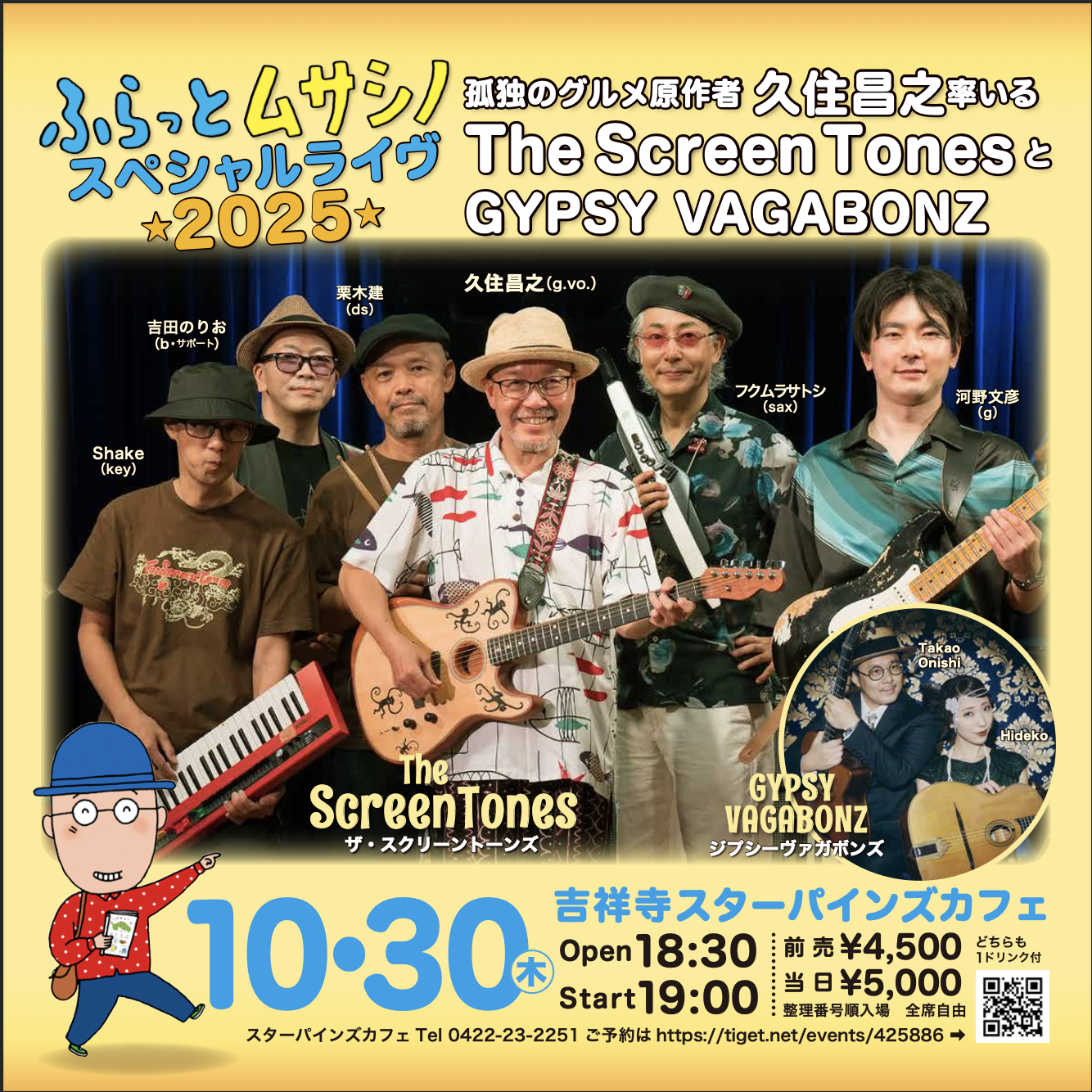 The Screen Tones とGYPSY VAGABONZ ~孤独のグルメ原作者・久住昌之さん率いるバンド「The Screen Tones」と、武蔵野市で活躍するバンドが出演する音楽ライブを開催!「ふらっとムサシノ」イベントのキックオフとして、音楽と地域の魅力をお楽しみいただけます。