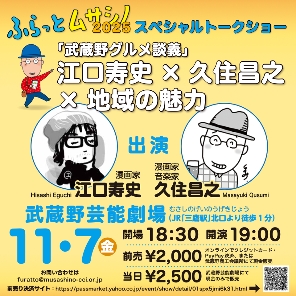 江口寿史 × 久住昌之 in 東京孤独のグルメ原作者・久住昌之さんと漫画家・江口寿史さんが、武蔵野市の情報サイト「むーなび」の大野編集長とともに、武蔵野市の食の魅力や地域の魅力について語り合うトークショーを開催!